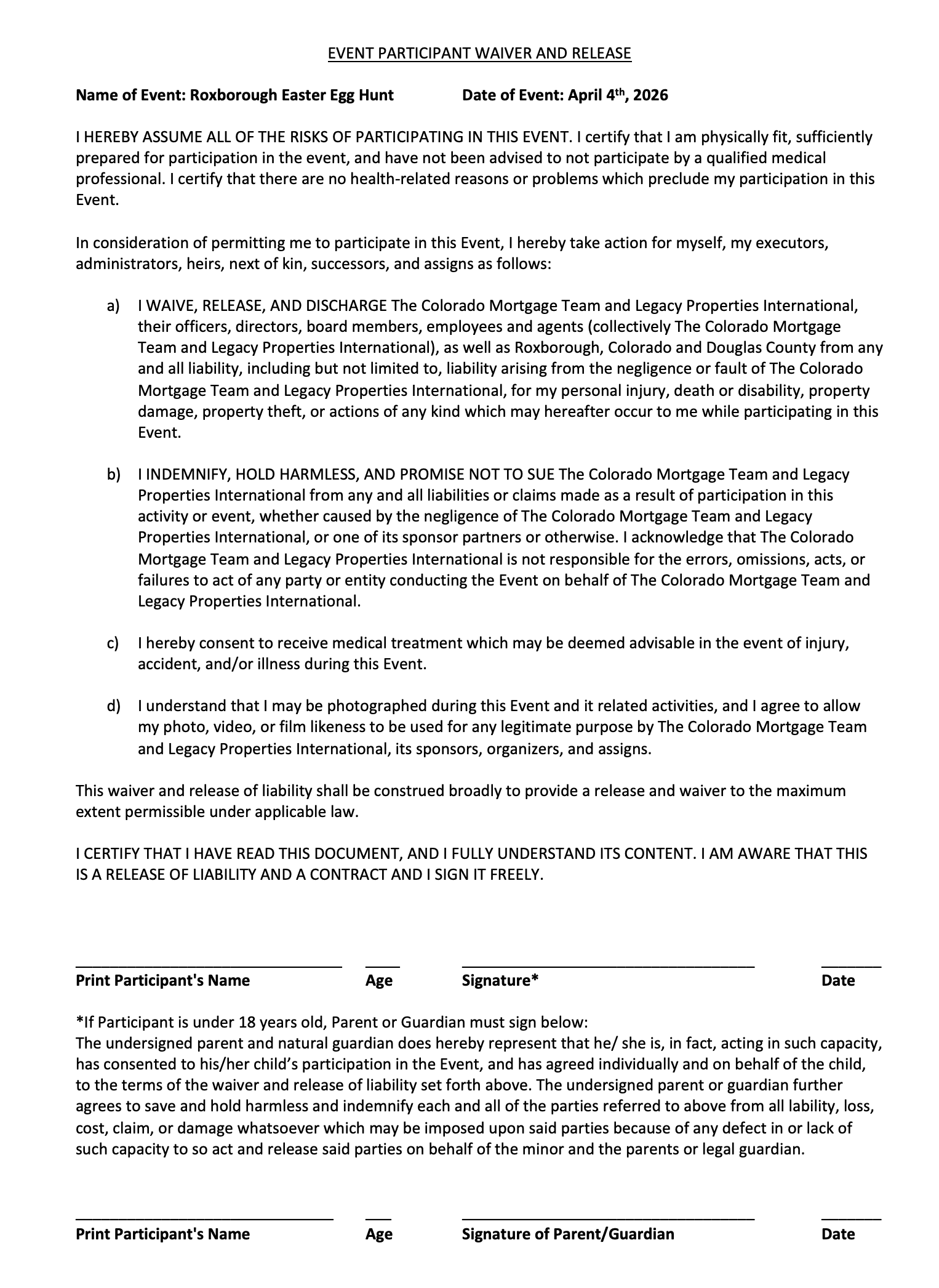By registering for the Roxborough Easter Egg Hunt, you hereby agree that your registration constitutes an electronic signature, indicating your acceptance of the terms outlined in the liability waiver. You acknowledge that you have read, understood, and voluntarily agreed to the terms of the waiver.